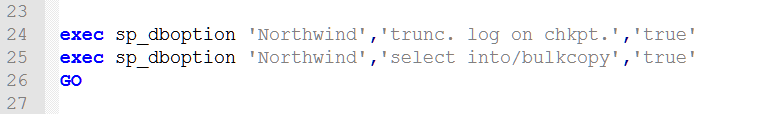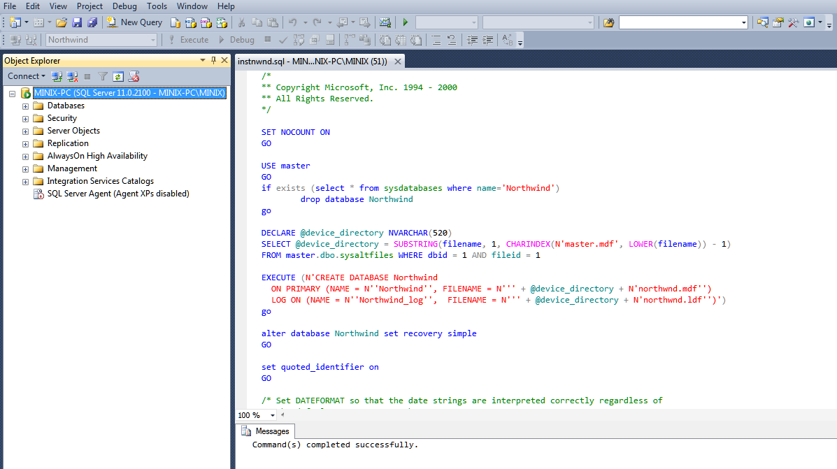 instnwnd.sql dosyasındaki satırların silinmesinden ve kaydet işleminden sonra Microsoft SQL Server Management Studio / File / Open / File ile instnwnd.sql dosyasını açıyoruz ve Execute (F5) tıklıyoruz. İşlem başarılı gerçekleştiyse eğer Messages penceresinde : Command(s) completed successfully. mesajını alıyoruz.
