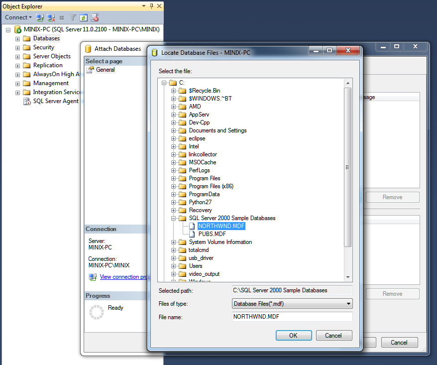 Kurulum sonrası C:SQL Server 2000 Sample Databases dizininde yüklenen örnek databaseleri göreceksiniz. Şimdi SQL Management Server'ı açalım. Object Explore menüsünde yer alan Databases sekmesine sağ tıklayıp Attach sekmesine tıklıyoruz;