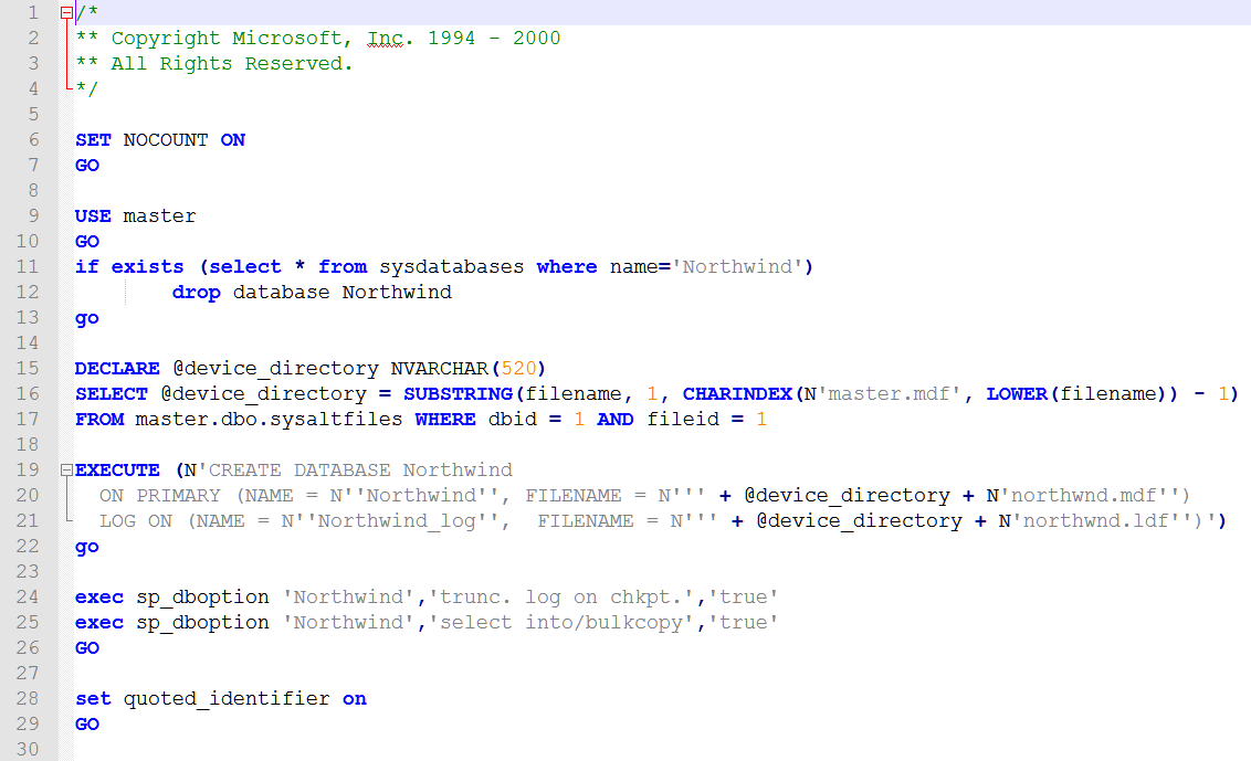 Öncelikle SQL Server 2000 Sample Databases dizininde mevcut bulunan "instnwnd.sql" dosyasına sağ tıklayarak Not Defteri veya Notepad++ tarzı bir editörle açıyoruz.