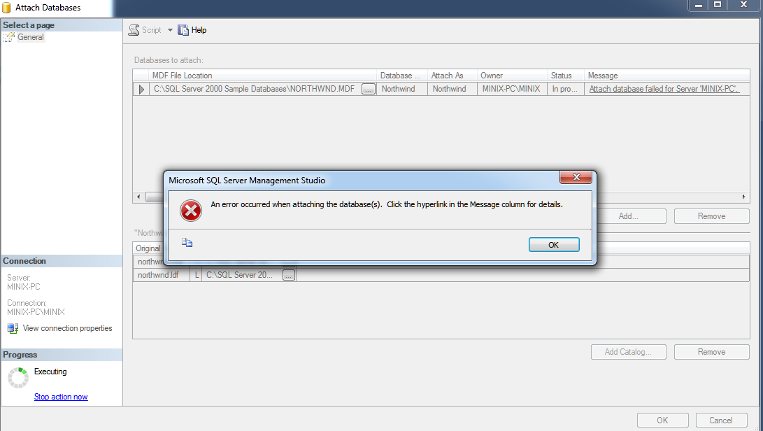 Son olarak OK butonuna basıyoruz ve işlemimiz tamamlanıyor. Fakat SQL 2008 ve SQL 2012 versionlarında resimdeki gibi bir hata mesajıyla karşılaşmanızda olası. Peki bu durumda Nortwind veritabanını yükleme işlemini nasıl gerçekleştireceğiz.