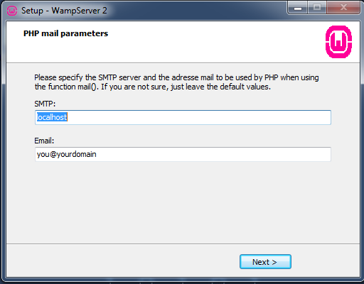 PHP mail atmak ister ise hangi adrese mail atacağını belirtmemizi istiyor. Kendinize ait bir mail adresi yazabilirsiniz. Üst kısım ise; kurulumu localde yapacağımız için "localhost" olarak kalmalıdır. Next ile ilerliyoruz…