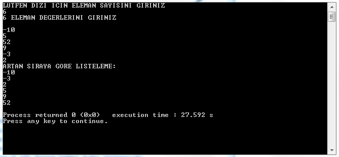 #include <stdio.h> int main() { int dizi[100], s, x, y, t; printf("LUTFEN DIZI ICIN ELEMAN SAYISINI GIRINIZ\n"); scanf("%d", &s); printf("%d ELEMAN DEGERLERINI GIRINIZ\n", s); for (x = 0; x < s; x++) scanf("%d", &dizi[x]); for (x = 0 ; x < ( s - 1 ); x++) { for (y = 0 ; y < s - x - 1; y++) { if (dizi[y] > dizi[y+1]) { t = dizi[y]; dizi[y] = dizi[y+1]; dizi[y+1] = t; } } } printf("ARTAN SIRAYA GORE LISTELEME:\n"); for ( x = 0 ; x < s ; x++ ) printf("%d\n", dizi[x]); return 0; }