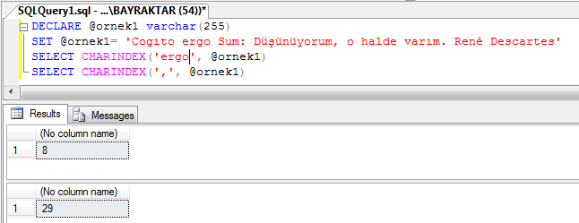 SET @ornek1= 'Cogito ergo Sum: Düşünüyorum, o halde varım. René Descartes'