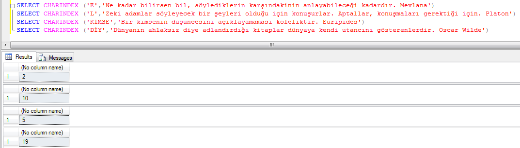SELECT CHARINDEX ('L','Zeki adamlar söyleyecek bir şeyleri olduğu için konuşurlar. Aptallar, konuşmaları gerektiği için. Platon')