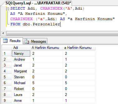 Örnek Sorgumuzda a ve A değerleri aynıdır. Aranan değerin ilk bulunduğu konumunun yeri döner. Diğer sonraki konumlar dikkate alınmaz. Yani tek karakter için büyük küçük harf ayrımı yoktur.